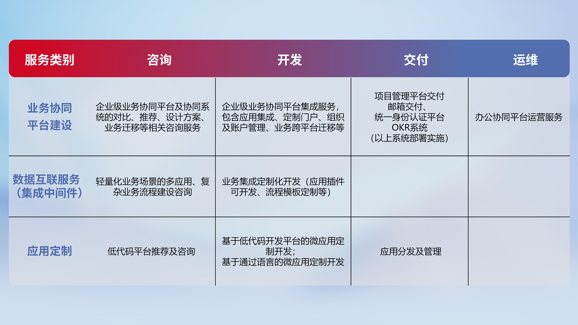 针对钉钉、、、、企微、、、IDaas等平台级产品提供产品的规划、、、、方案、、、、交付、、、、定制化开发等服务,,实现如统一协同办公、、、智能客户服务、、、混合会议管理、、智能数据查询、、、等业务场景,,实现数字化转型。。